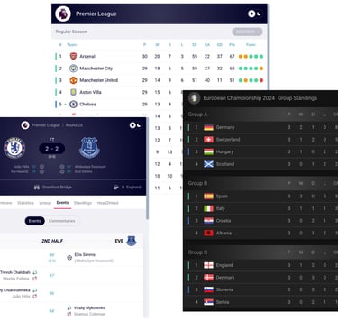Resultados, estadísticas y calendarios listos para integrar en cualquier sitio web.